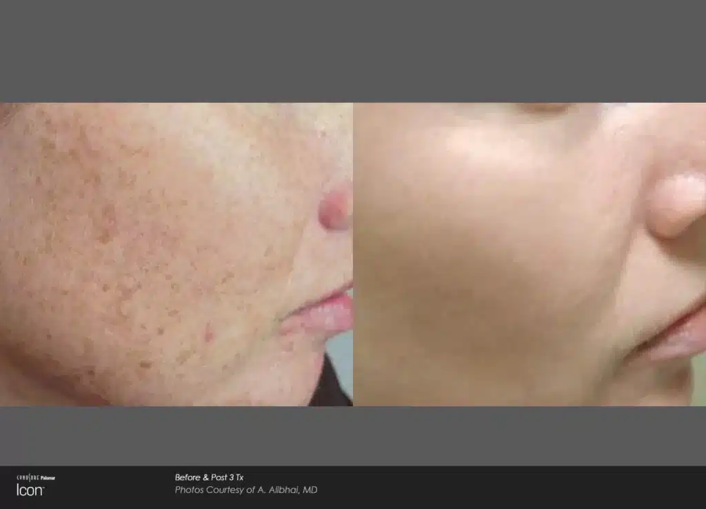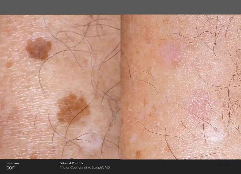 The Lumenis™ & Icon™ utilize optimized pulsed light technology which, unlike lasers, uses many wavelengths of light with special filters that deliver the best wavelengths to treat specific aesthetic conditions. As the handpiece glides over the area being treated, specialized pulses of light are delivered into your skin and target brown spots, sun-damage and vessels without causing harm to the surrounding skin. Once these targets absorb the energy they are destroyed and will slowly disappear through your body’s natural healing process. You will see your brown spots turn darker in color and flake off over the next few weeks. You may also see an immediate improvement in your vessels with a continued clearance over the next few weeks.